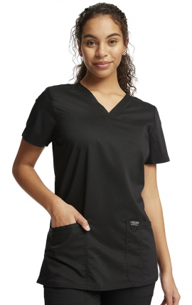 80% Polyester/20% Spandex A tuck-in top with all the storage of a traditional v-neck top. Cherokee Achieve's ComfortPro fabric combines with updated styling, plenty of pockets...