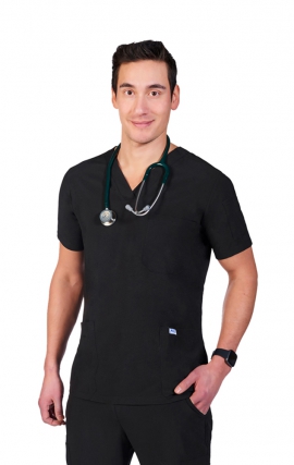 73% polyester, 22% rayon, 5% Spandex stretch twill Every guy’s wardrobe needs a go-to scrub top. This is our pick, a super soft top that’s breathable with 4-way stretch. Contemporary fit. -Classic v-neck-Chest pocket-Moisture-wicking-4-way stretch-Easy care Length Size L: 30 1/2″