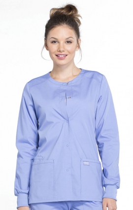 RAISE YOUR EXPECTATIONS Here's a job-ready button-front jacket you can wear all day without that too-layered feeling. The WonderWink button front scrub jacket features a novel neckline and 100 percent polyester construction that brings new life to an office standard. Generous sleeves can go the distance and conceal the rib knit cuffs.
