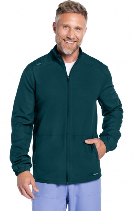 This Men's Modern fit zip front jacket features a stand-up collar and stylized front and sleeve seams. There are four pockets: one in-seam zipper chest pocket on the wearer's left side, two front welt pockets and a hidden mesh cell phone pocket inside the right bag. Back side panels and a curved back yoke seam elevate this layering piece. Sleeve cuffs and a banded bottom. Center back length: 27 ½" Collection: Cherokee FormFit: Men's...