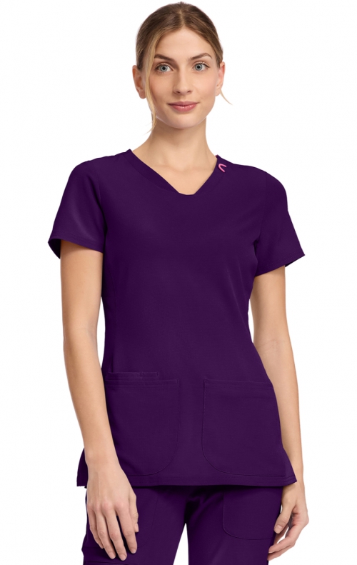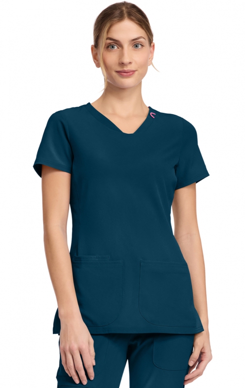 This Missy fit v-neck top has a shaped neckline with a bungee ID badge loop on the wearer's left side. There are three pockets for storage: two patch pockets plus an additional cell phone pocket with bartacked pen slot. Twill tape instrument loops inside the wearer's right pocket for additional storage. Front and back princess seams add fit and shaping while dyed-to-match rib-knit side panels provide comfort and stretch. A rounded hem and side vents complete the look.