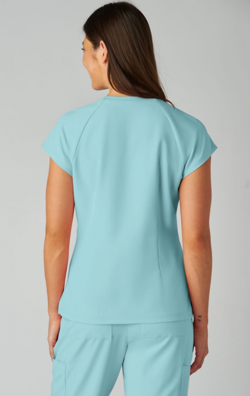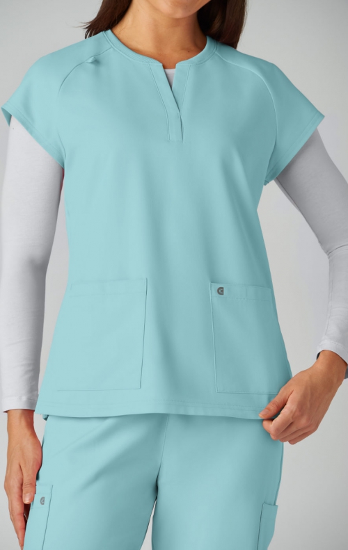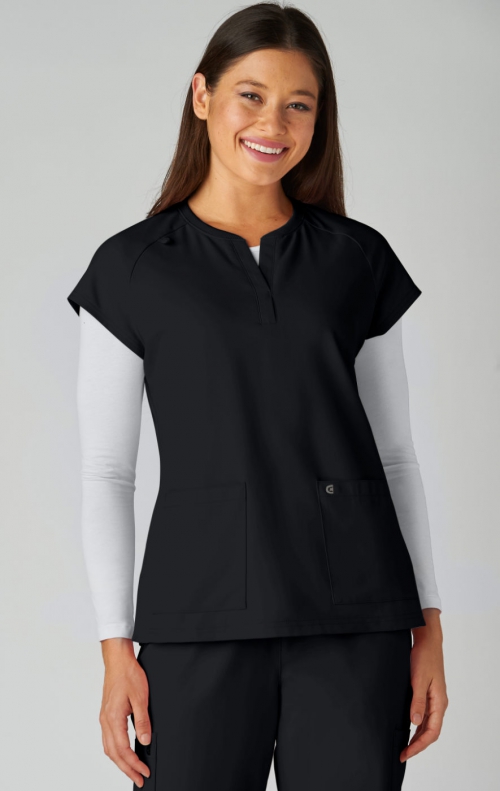 Style meets substance in this modern, split-neck scrub top designed to keep you looking sharp and feeling confident all day. This flattering silhouette features a soft rib-knit collar and raglan sleeves for a touch of sporty ease. Functional details like an ID badge loop at the shoulder, two roomy patch pockets, and side slits make it perfect for life on the move.