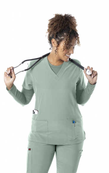 Experience the pinnacle of comfort and functionality with the FUBU Performance Scrubs, style 62-4202. This V-Neck top is meticulously designed with the professional in mind, featuring an ID loop on the shoulder for easy access and organization. The top boasts five double-stitched pockets in total, including two lower patch pockets with two utility pockets and one dedicated cell pocket, ensuring ample storage for all your essential tools.
