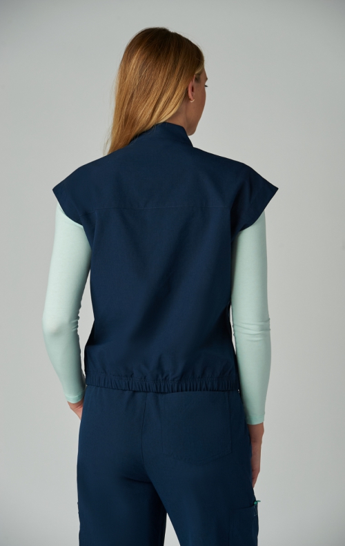 Fresh, modern, zip-front vest with ID badge loop, four pockets, pen slot, and contrast tape with D-ring. Made with koi's ultra-durable yet silky-soft ExoFlex™ ripstop stretch fabric.