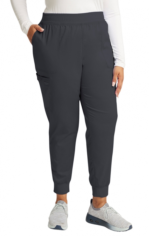 This Modern Classic fit mid rise pull-on jogger has an encased elastic knit waistband with interior drawstring. There are five pockets: two front patch pockets, a double cargo pocket with a bungee ID badge loop, and one back patch pocket. The pant also features a tapered leg and knit cuffs.