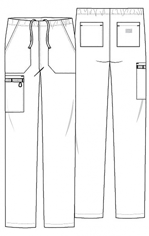 This unisex fit pant has an interior elastic waistband with an inside drawstring. There are five pockets: two front pockets, one cargo pocket with twill tape utility loops plus a bungee badge ID loop, and two back patch pockets.