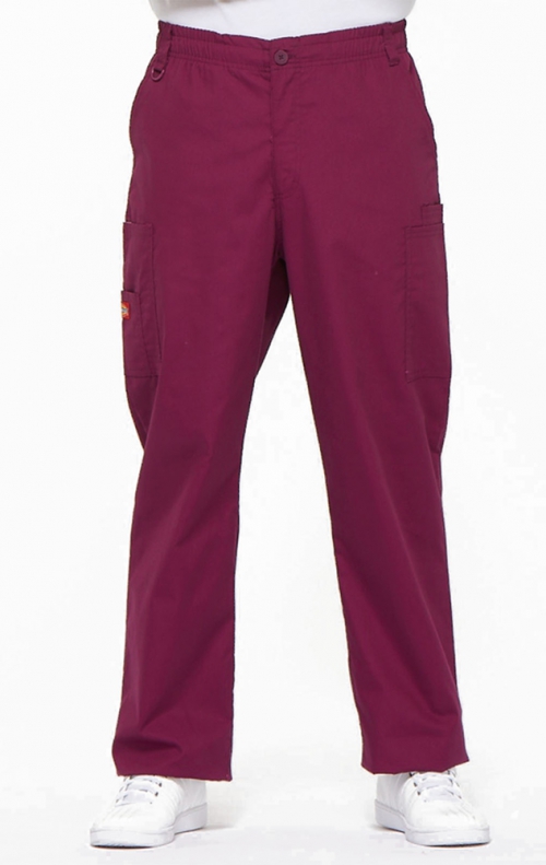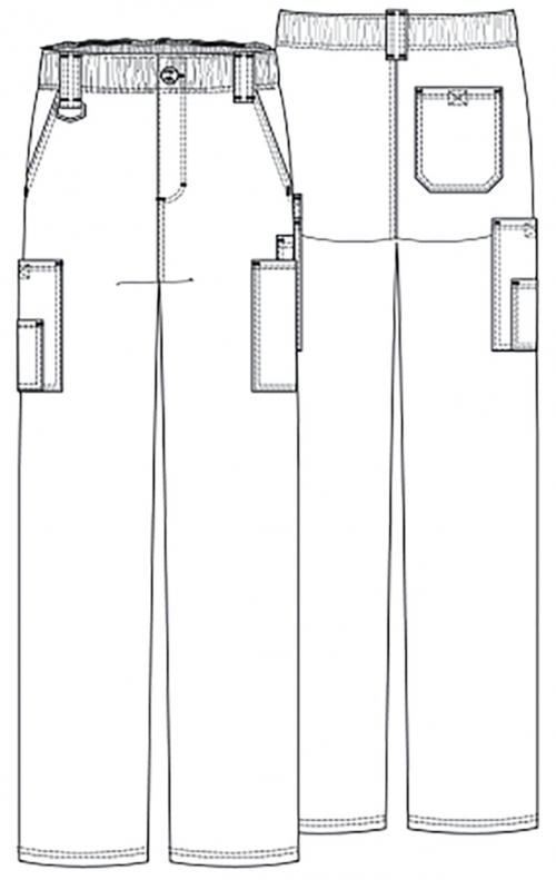 Men's fit zip fly pull-on pant features an all-around elastic waistband with a button closure, an adjustable interior drawstring, three belt loops, and Dickies logo twill tape on the inside back waistband. There are two front angled pockets, two cargo pockets, two utility pockets, and a back pocket. Right cargo pocket and back pocket have hook-and-loop fasteners for security. A D-ring on right front belt loop and double-needle topstitching throughout complete the look.
