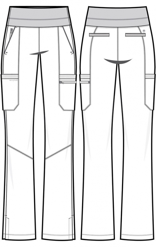 The Tina Pant is a Modern fit bootcut pant featuring a high rise pull-on yoga knit waistband. There are 8 pockets for organized storage: 2 front slant pockets, 1 front zipper pocket, 2 cargo pockets with multi-needle stitching (right with hidden instrument loops), 1 zip cargo pocket with Healing Hands logo zipper pull, and 2 back welt pockets. Knee seams and logo grommets add visual interest. Side vents at hem.