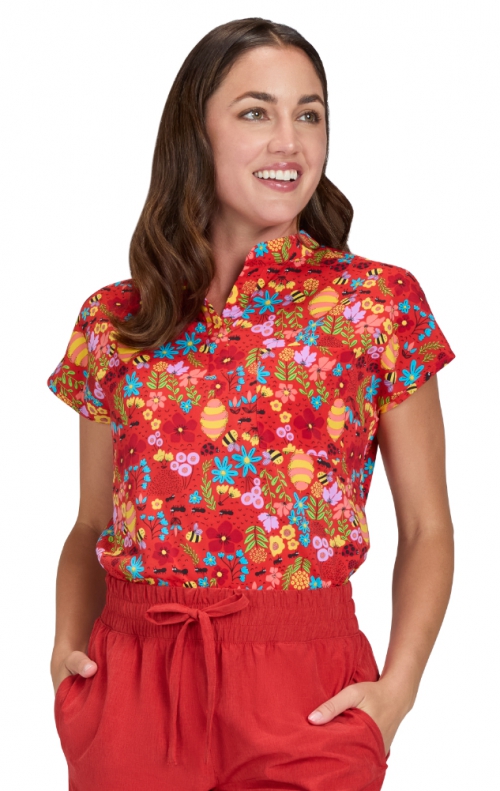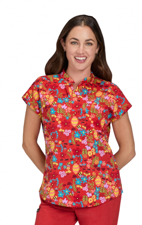 This unique, contemporary stretch print scrub top from the koi Artists Series is part of koi's exclusive collab with surface pattern designer and illustrator Sandra Hutter. A former nurse, Sandra creates vibrant, bold, and feel-good designs that infuse color and joy into everyday surroundings. Sandra has a passion for spreading positivity through art and creating designs that brighten the spaces they inhabit. This limited edition top features a stylish split neckline, cap sleeves, a slightly shaped silhouette, and a chest pocket for easy access. Looks great tucked in or out.