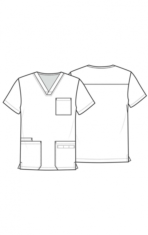 This Unisex fit V-neck top features a chest pocket, two patch pockets, a cell phone pocket, hidden instrument loops inside left pocket, back yoke seam and side vents.