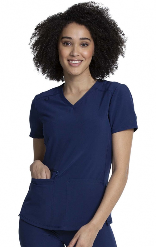 This Contemporary fit V-neck top has front and back yoke seams and a bungee ID badge loop at the right front yoke. Other features include front and back princess seams, front side panels, side vents and a shirttail hem. There are three pockets: two front patch pockets and one zip cell phone pocket.