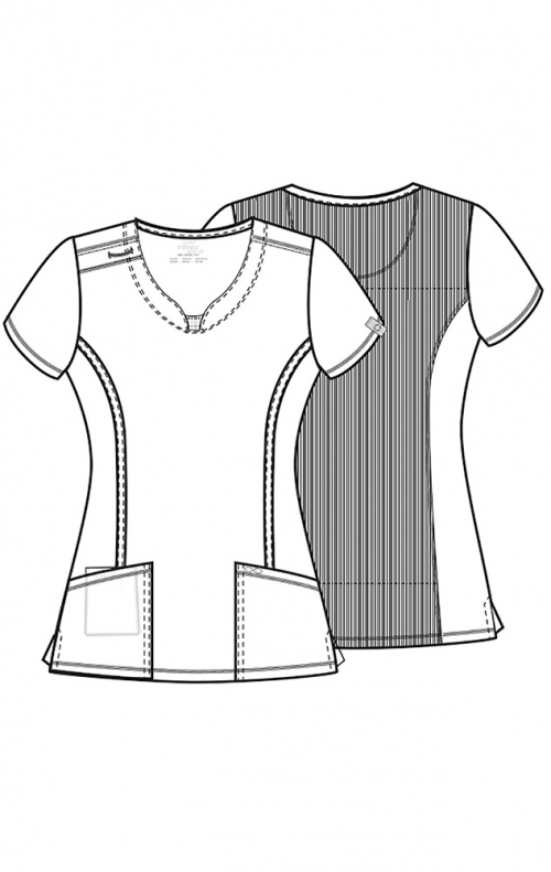A Contemporary fit round neck top with a rib-knit inset at the front neckband also features shoulder yokes, a bungee ID badge loop on the right shoulder, front and back princess seams, two patch pockets, one interior pocket, and side vents. Stretch rib-knit at the center back panel gives this top its slimming shape and allows for extra movement and comfort. Coverstitch detail throughout. Center back length: 26". The comfortable stretch poplin fabric and super stretchy rib knit are the perfect combos for healthcare professionals.