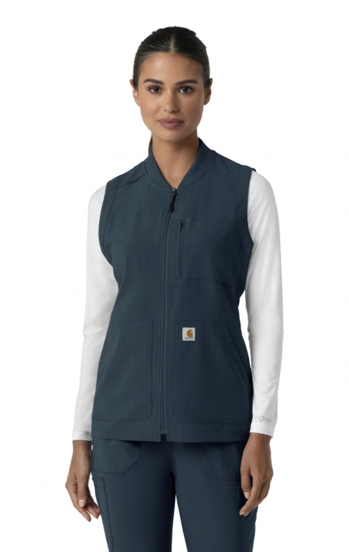 This women's Carhartt scrub vest is designed for the active healthcare professional who values practicality and performance. Utilizing Rugged Flex™ stretch technology, it provides exceptional flexibility, allowing for unrestricted movement during demanding tasks. A key feature is the mesh-lined back vent, which promotes airflow and helps regulate body temperature, keeping you cool and comfortable throughout your shift. The durable construction and thoughtful design details make it a reliable choice for professionals who need a vest that can keep up with their demanding schedules. It's an ideal addition to any healthcare professional's wardrobe, providing both practicality and comfort.