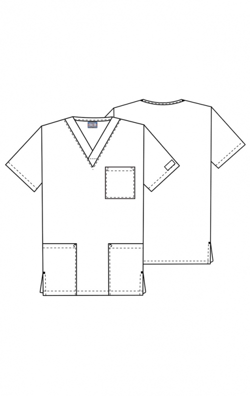 This Unisex Traditional fit V-neck top has one chest pocket and two patch pockets. Side vents.