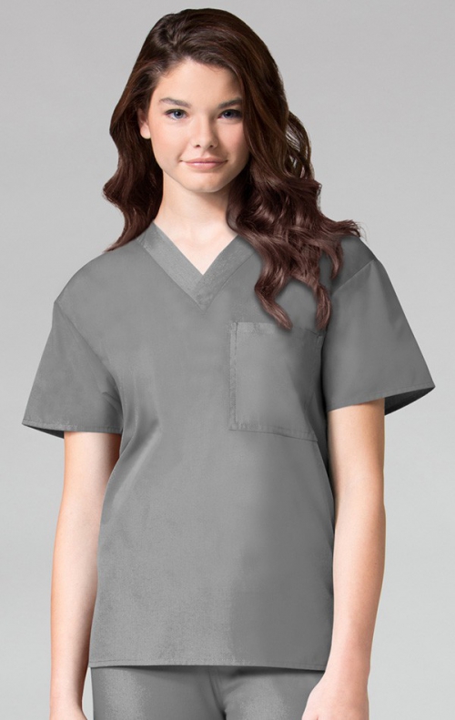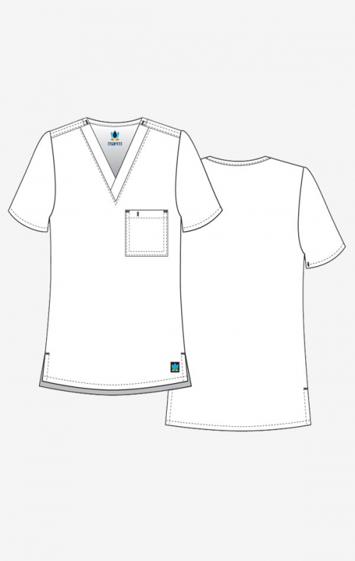 Constructed with Maevn's superior plain weave poplin fabric. Unisex fit V-neck top. One chest pocket with pen slot. Double stitched at shoulders and pockets for durability. Set in sleeves for mobility. Tagless for added comfort.