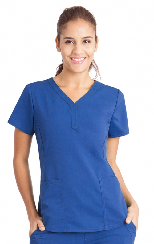 Healing Hands flattering Jane top features a "Y" shaped neckline and triple needle stitching on the neckline and pockets. For a superior fit, there is front seam and side slits. A shirt tail hem and a Healing Hands embroidery logo on left front pocket complete this Junior fit scrub top. Fabric 77/20/3 poly/rayon/spandex. The length is 26".