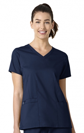 Étirement mécanique 100% microfibre - Plateau asymétrique à enveloppement simulé- 2 poches doubles inférieures à chargement par le haut avec poche sectionnelle- Poche pour téléphone portable- Pochette utilitaire et fente pour stylo- Bague en silicone Wonderwink- Boucle d’insigne d’épaule- Évents latéraux Coupe moderne et fidèle à la taille pour femme