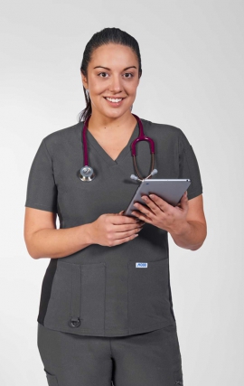 Étirement mécanique 100% microfibre - Plateau asymétrique à enveloppement simulé- 2 poches doubles inférieures à chargement par le haut avec poche sectionnelle- Poche pour téléphone portable- Pochette utilitaire et fente pour stylo- Bague en silicone Wonderwink- Boucle d’insigne d’épaule- Évents latéraux Coupe moderne et fidèle à la taille pour femme