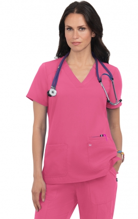 95% Polyester/5% Dobby en Spandex Le haut Contemporary fit V-neck est doté de poches plaquées arrondies avec une petite poche intérieure, une boucle élastique rose extérieure...