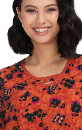 Ce haut à imprimé irrésistible se distingue par son encolure unique à trou de serrure....