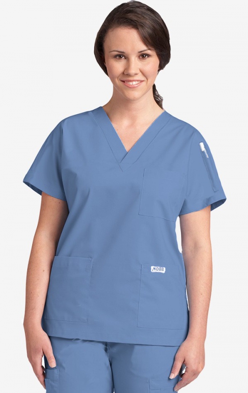 Un haut col V unisexe classique. Ce haut a une ligne de base légèrement plus ce qui en fait un excellent choix pour n'importe qui avec une taille plus grande. Comprend trois poches avant, une poche stylo d'épaule et est disponible dans toutes les couleurs MOBB. Va bien avec toutes les couleurs de pantalon MOBB.