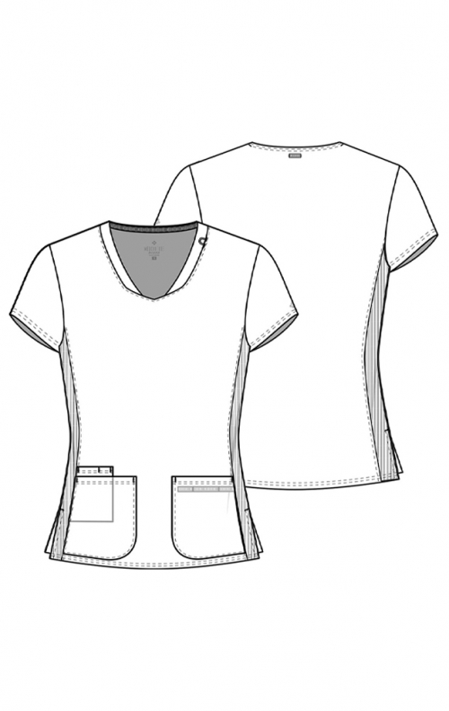 Ce haut à col en V Missy fit a une encolure en forme avec une boucle de badge ID élastique sur le côté gauche du porteur. Il y a trois poches pour le stockage: deux poches plaquées plus une poche supplémentaire pour téléphone portable avec fente pour stylo. Le ruban sergé boucle les instruments à l’intérieur de la poche droite du porteur pour un rangement supplémentaire. Les coutures princesse à l’avant et à l’arrière ajoutent de l’ajustement et de la forme, tandis que les panneaux latéraux en tricot côtelé teints pour correspondre offrent confort et élasticité. Un ourlet arrondi et des fentes latérales complètent le look.